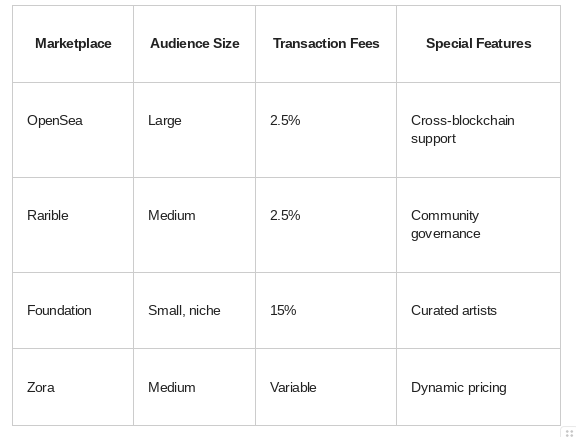 Look for marketplaces with a large user base, low fees, strong security measures, and an easy-to-use interface. Also, consider supportive communities and features that align with your NFTs. Some platforms offer creator funds or promotional opportunities.