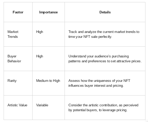 Research the market to understand the pricing of similar NFTs. Factor in your creation costs and perceived value. Consider the utility and rarity of your NFT. Use a competitive pricing strategy that balances profit with attractiveness to potential buyers.