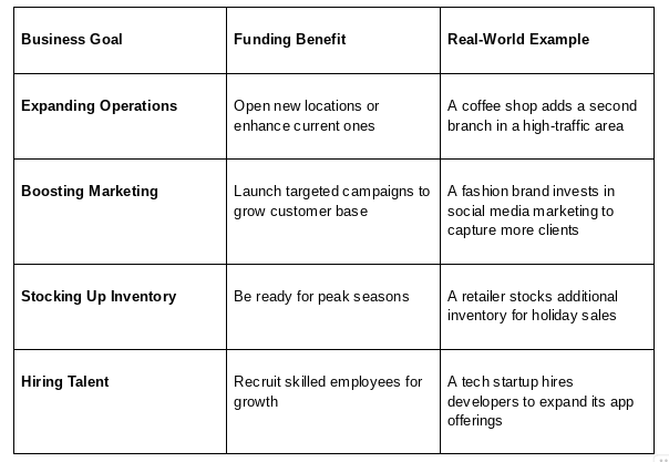 Whether you're looking to expand your product line, enhance marketing efforts, secure inventory for high-demand periods, or hire the right talent to take your business further, this funding can be the catalyst that transforms your ideas into action. With quick access and a flexible approval process, you?re empowered to focus on growth, not red tape.