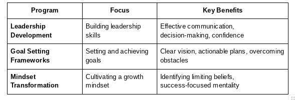 Our offerings include leadership development, goal-setting frameworks, and mindset transformation workshops to help members reach their full potential.